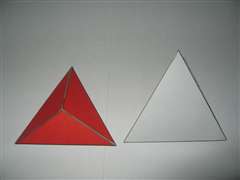 左のが正四面体を合同に4分割した三角錐です。右の写真は4つ集めて正四面体にしている途中です。これを8個作ってつなげたのが次の写真です。